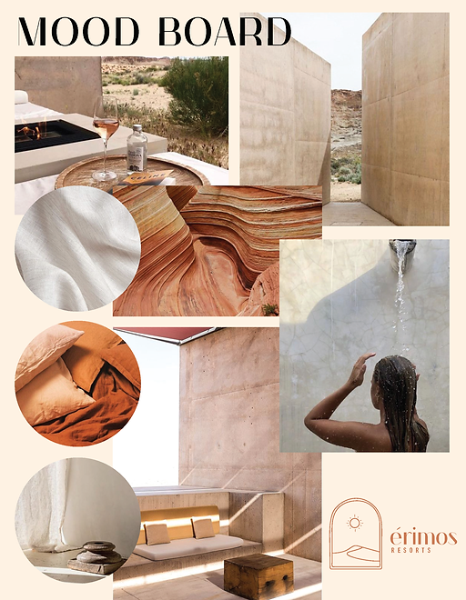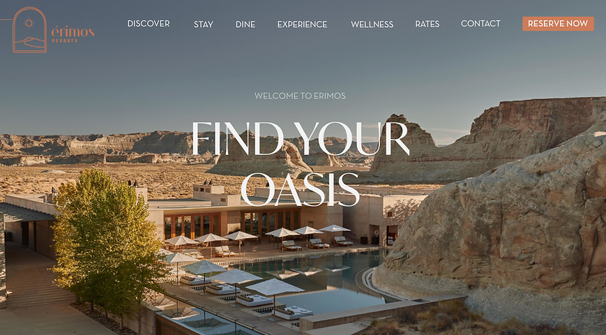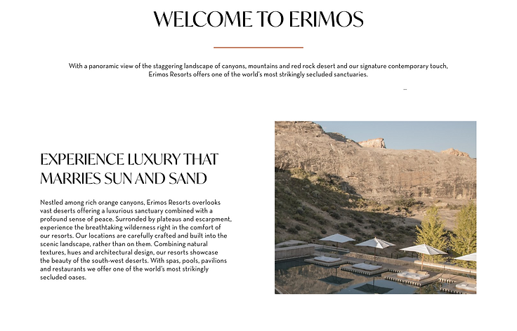 design, Erimos Resorts showcase the beauty of the south-west deserts. With spas, pools, pavilions and restaurants we offer one of the world’s most strikingly secluded oasis. This brand and company concept was something I created top to bottom applying UX Design, Website Development and Target Market Profiles.